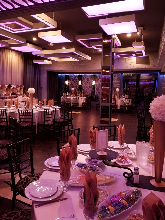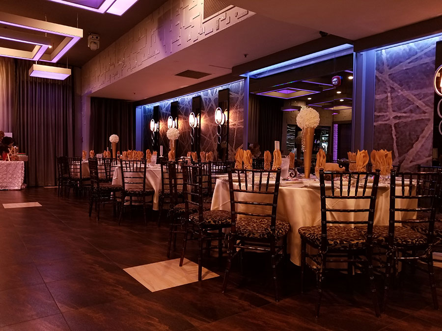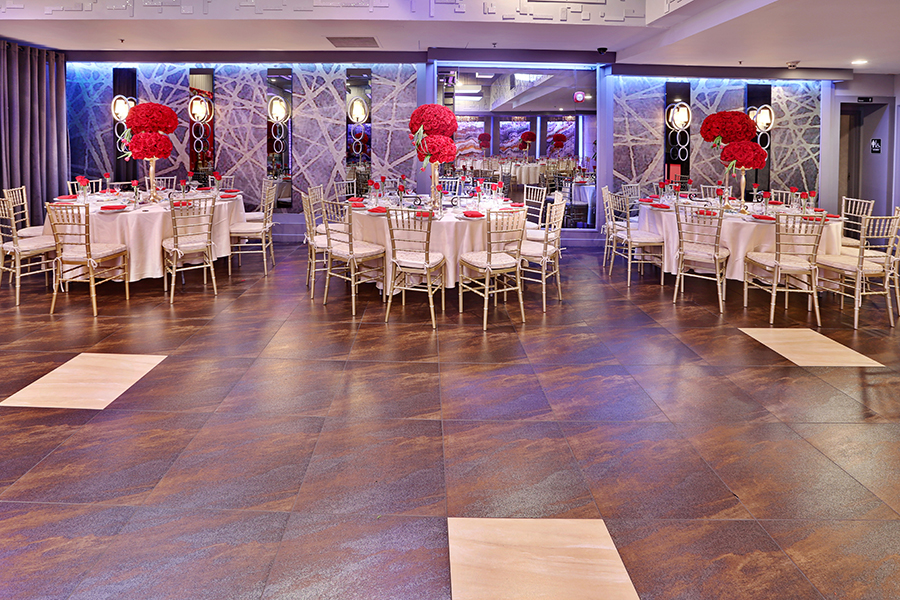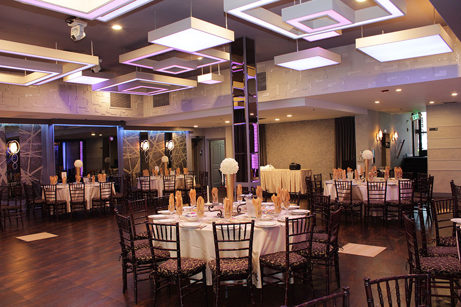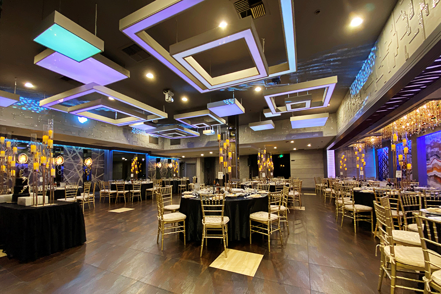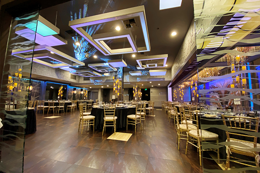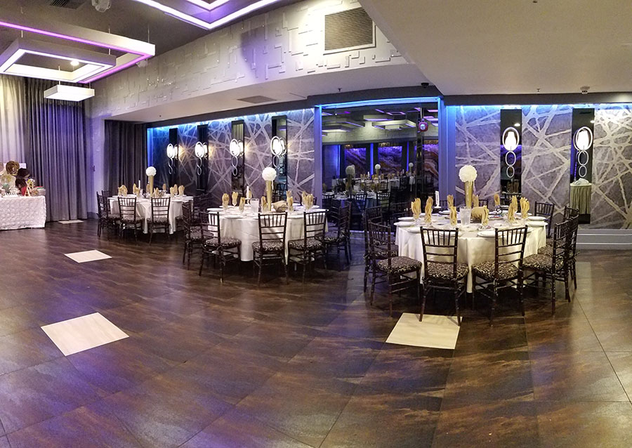 The De Luxe ballroom features over 4,300 square feet of immaculately-decorated space. Our ballroom features an expansive dance floor, a rotating crystal chandelier, LED ambient lighting, and a grand foyer for impressive entrances.